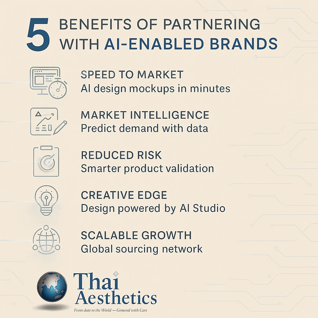 Distributors who embrace AI-enabled partnerships gain more than just new products — they gain access to a smarter business ecosystem. Thai Aesthetics combines 35+ years of sourcing experience with AI-powered design intelligence to help partners grow with confidence and creativity.