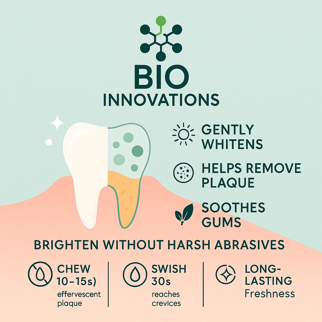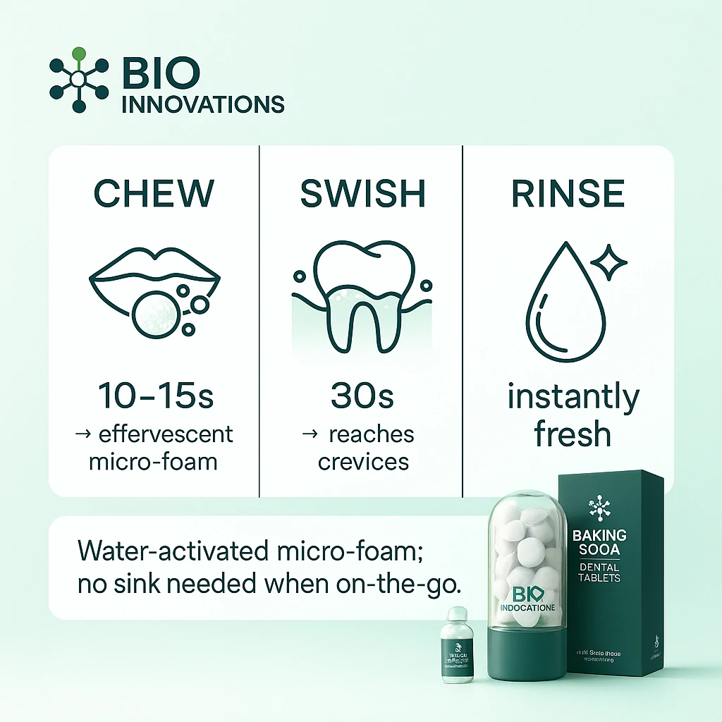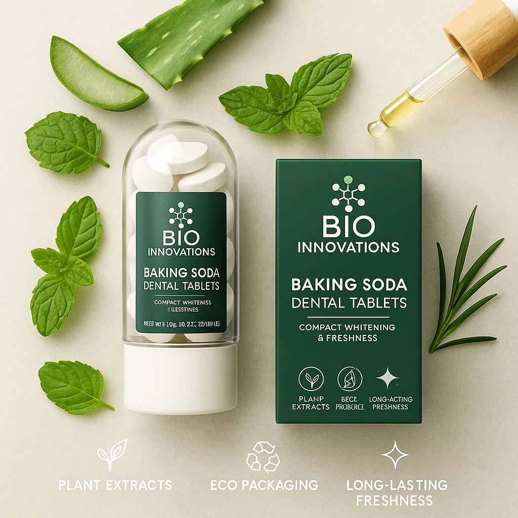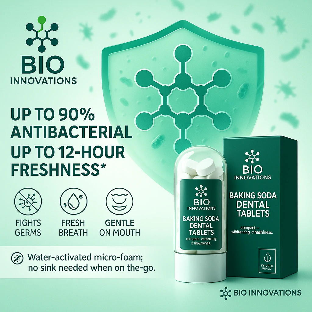 Bio Innovations Baking Soda Dental Tablets combine natural whitening power with portability, reducing plastic waste and ensuring on-the-go oral care.