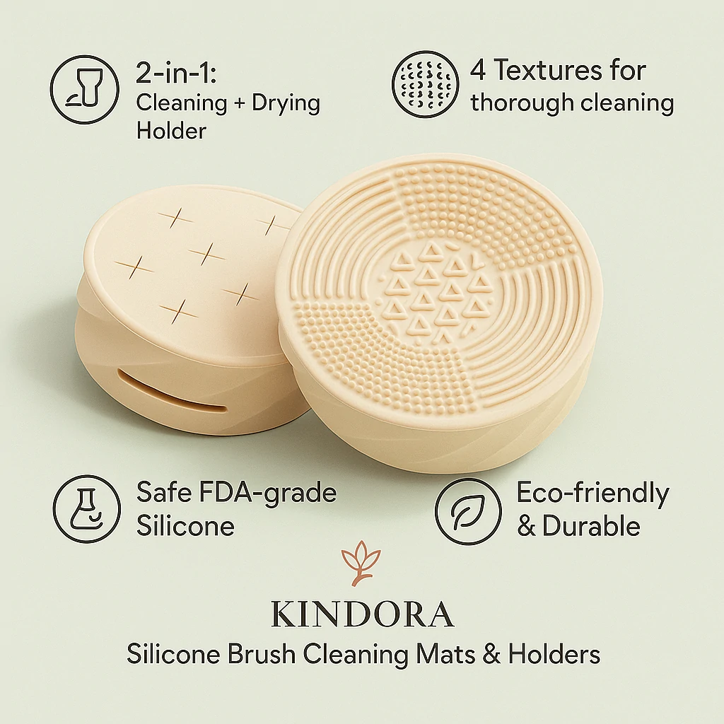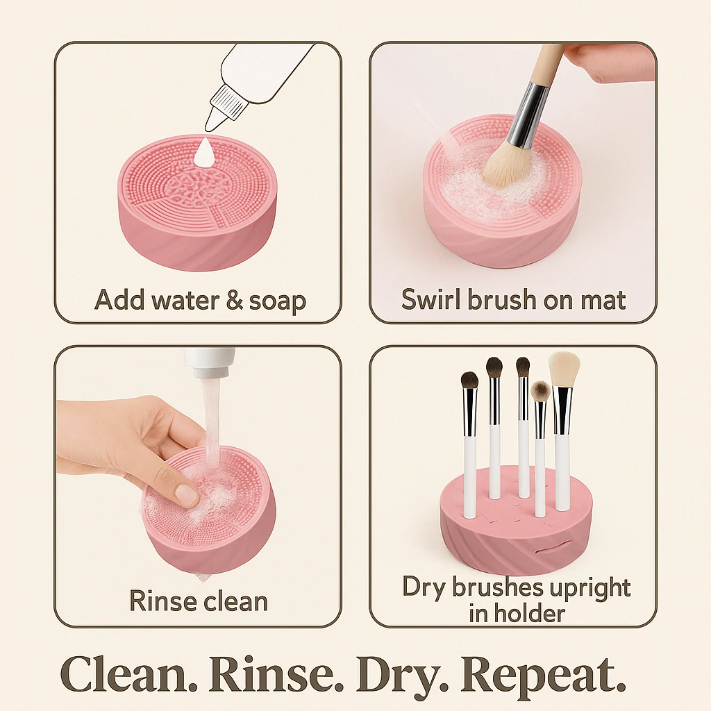 Keep brushes hygienic with textured wash mats and drip‑dry holders—extend brush life and improve makeup results.