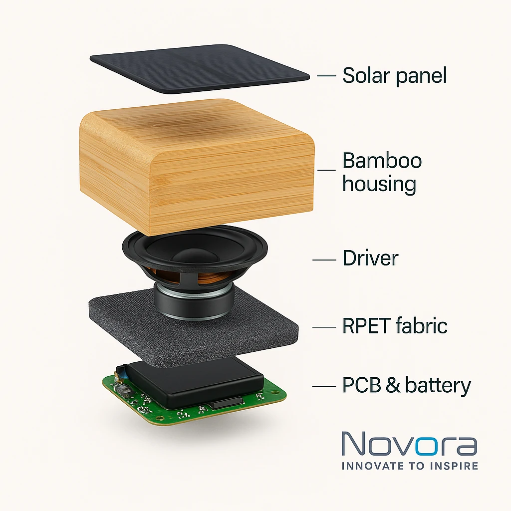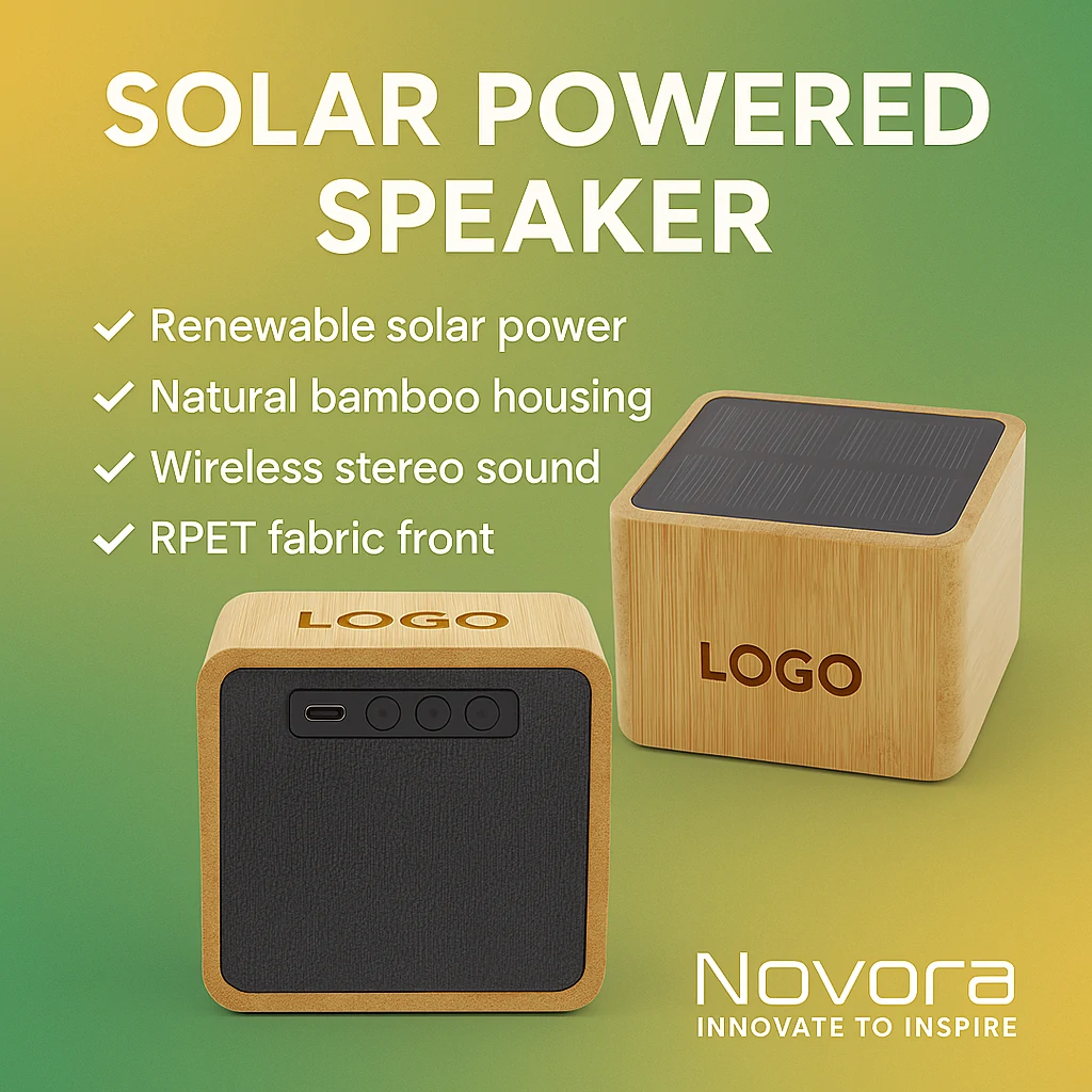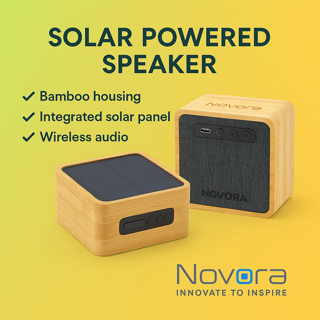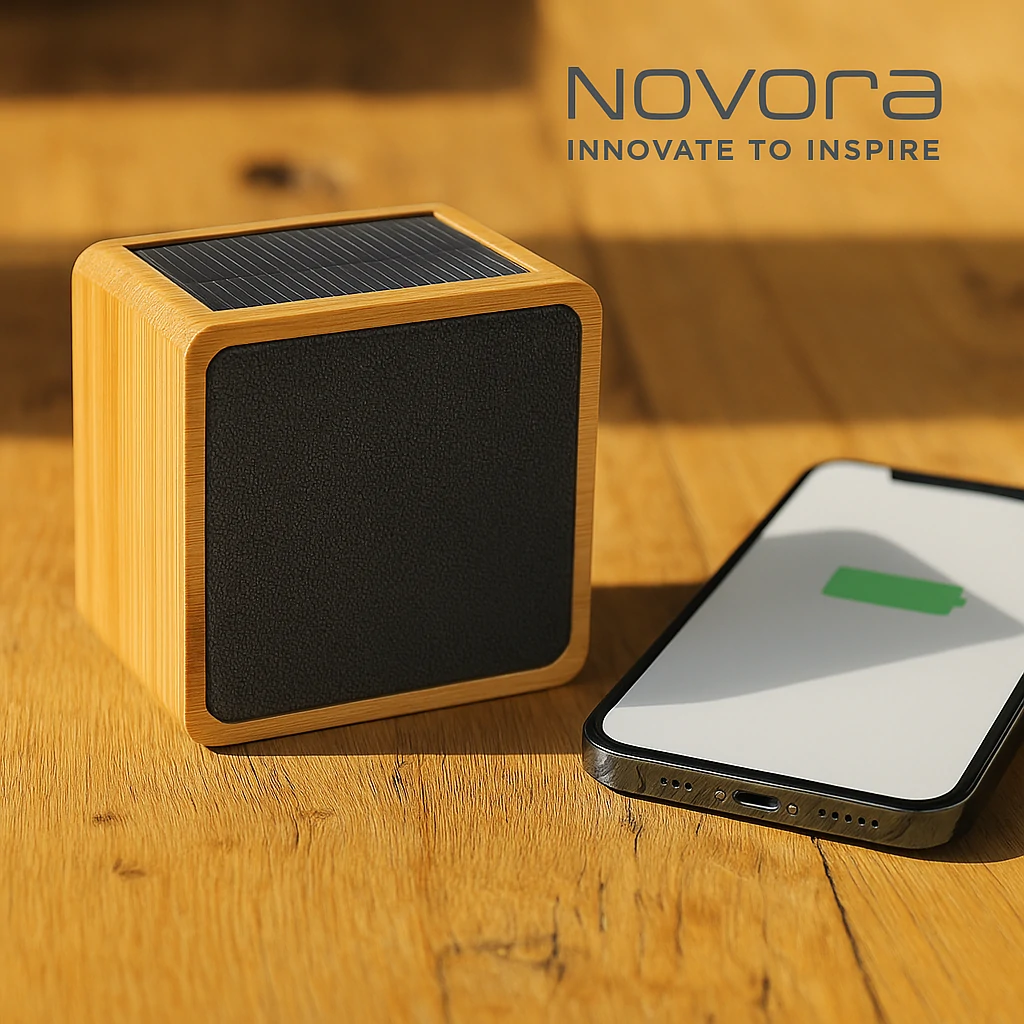 Eco-friendly solar powered Bluetooth speaker with FSC bamboo casing.