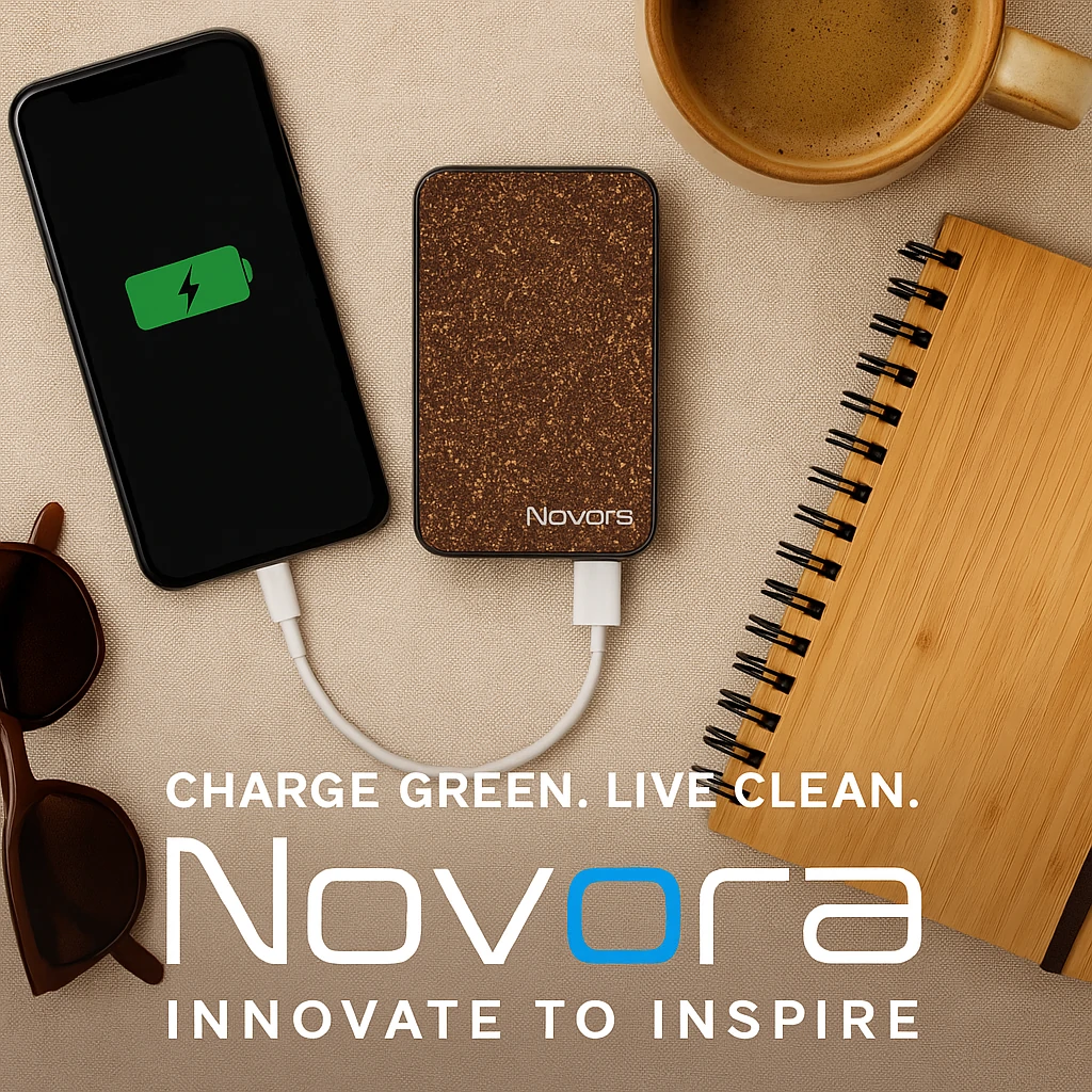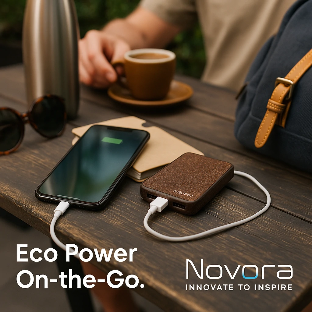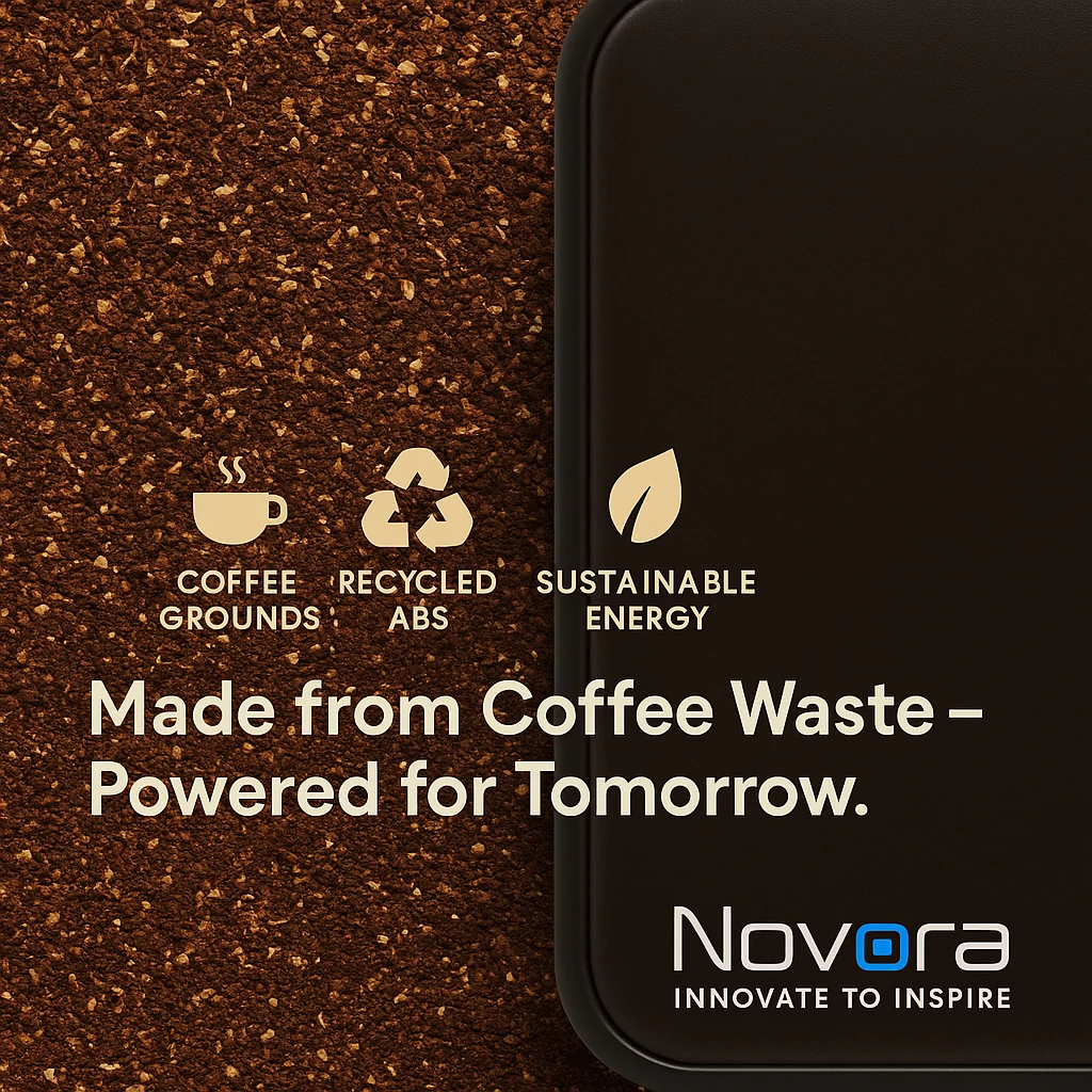Coffee Grounds Power Bank combines modern functionality with eco-conscious materials, showcasing Novora’s blend of technology and sustainability.