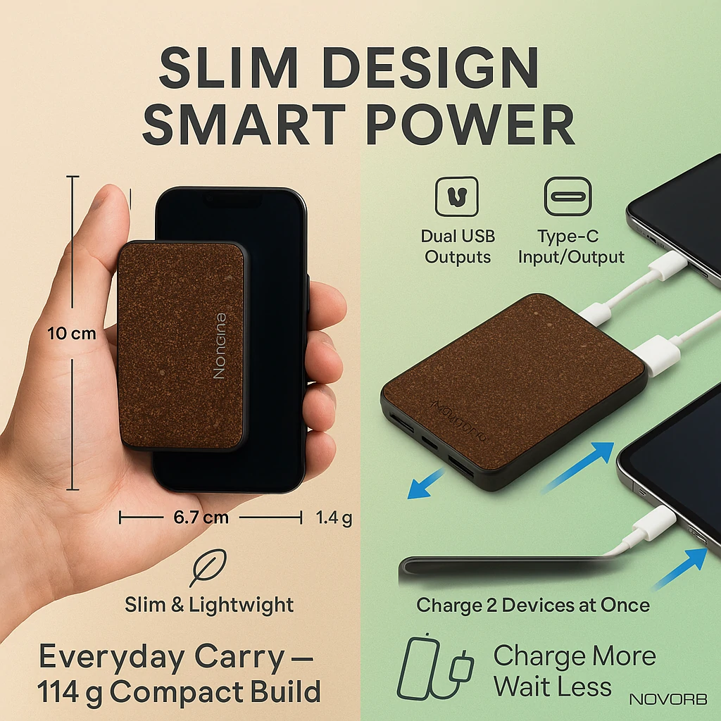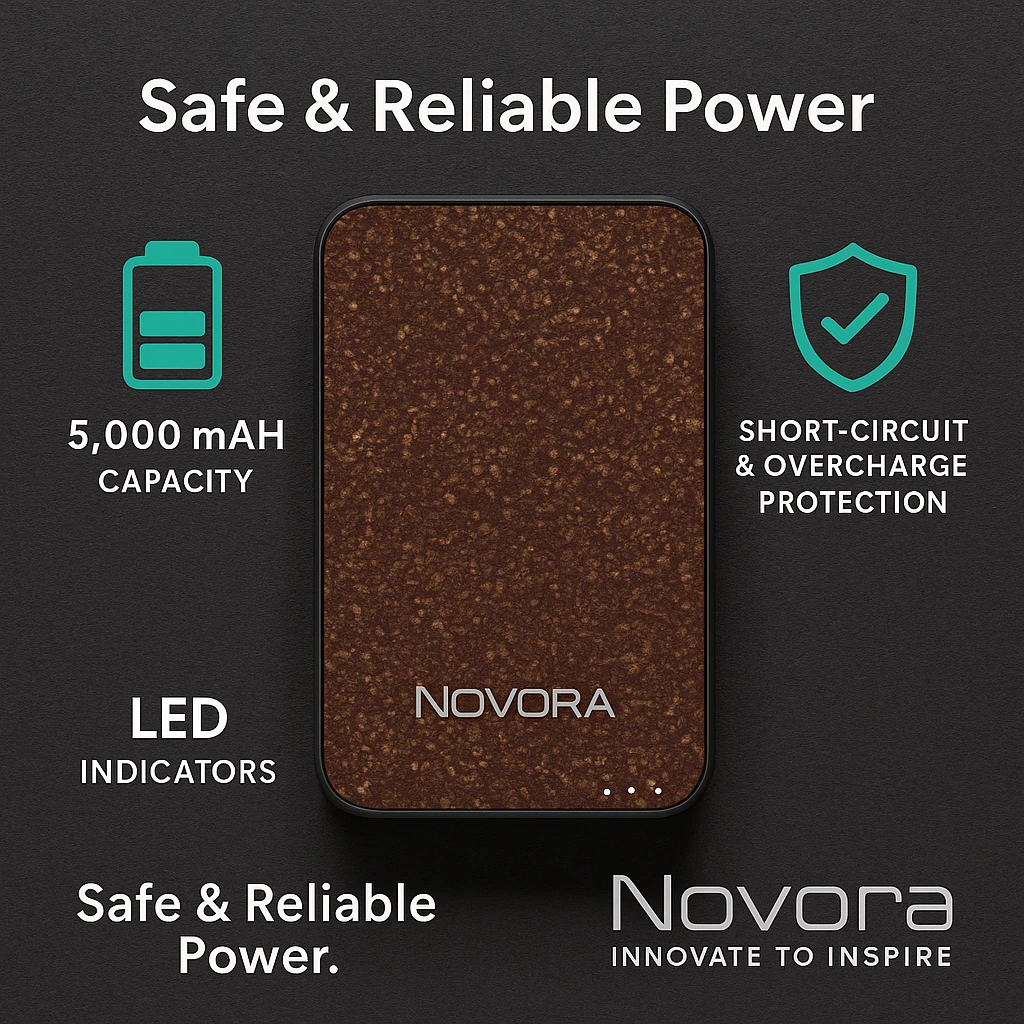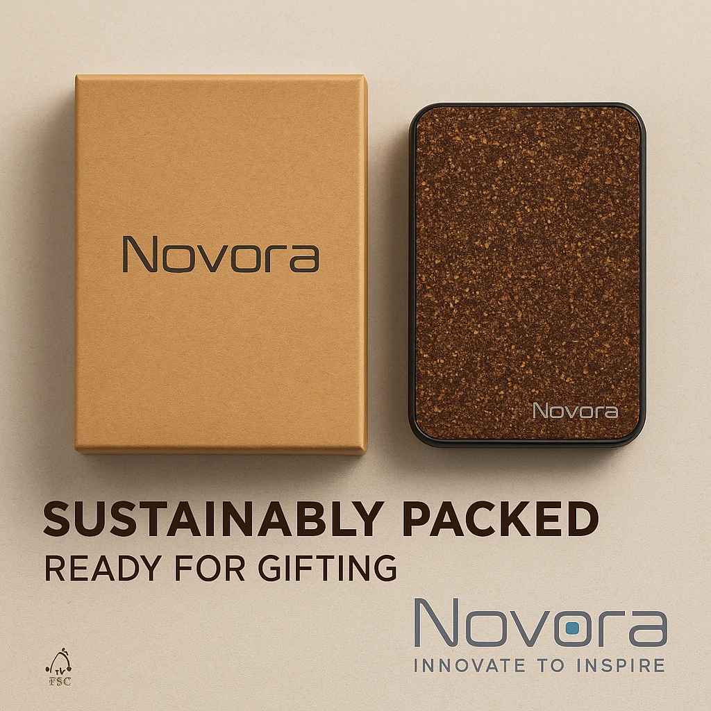Coffee Grounds Power Bank combines modern functionality with eco-conscious materials, showcasing Novora’s blend of technology and sustainability.