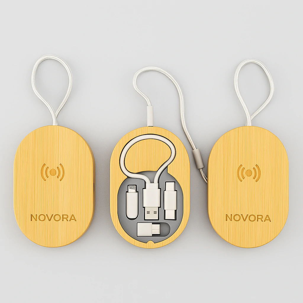 Multi-functional charging combi set combining wireless charging, cables, and portability.