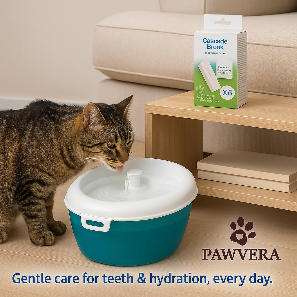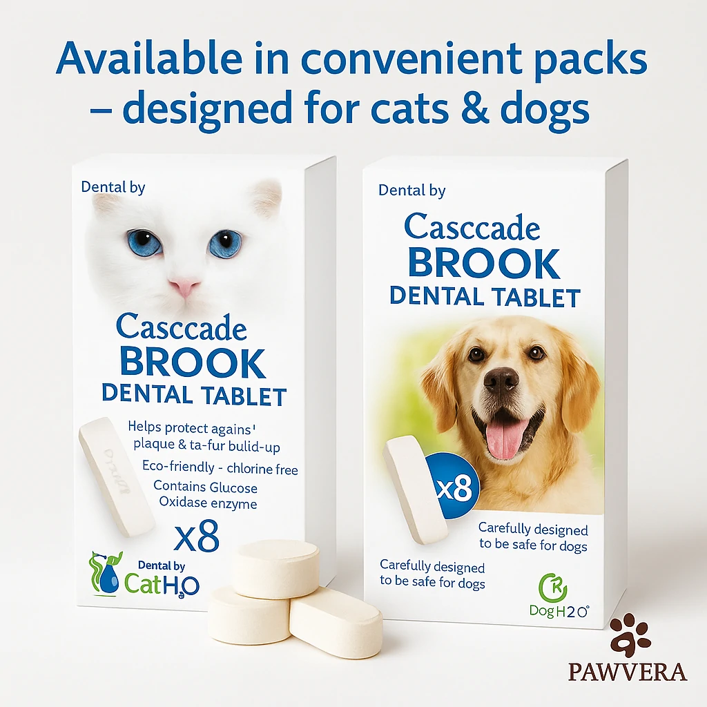 Cascade Brook tablets dissolve gently in fountain water, helping reduce plaque, tartar, and bad breath. Safe, natural, and easy to use — they turn daily hydration into simple, effective oral care for pets