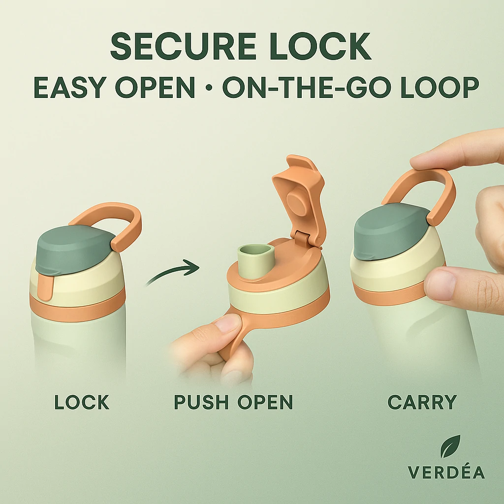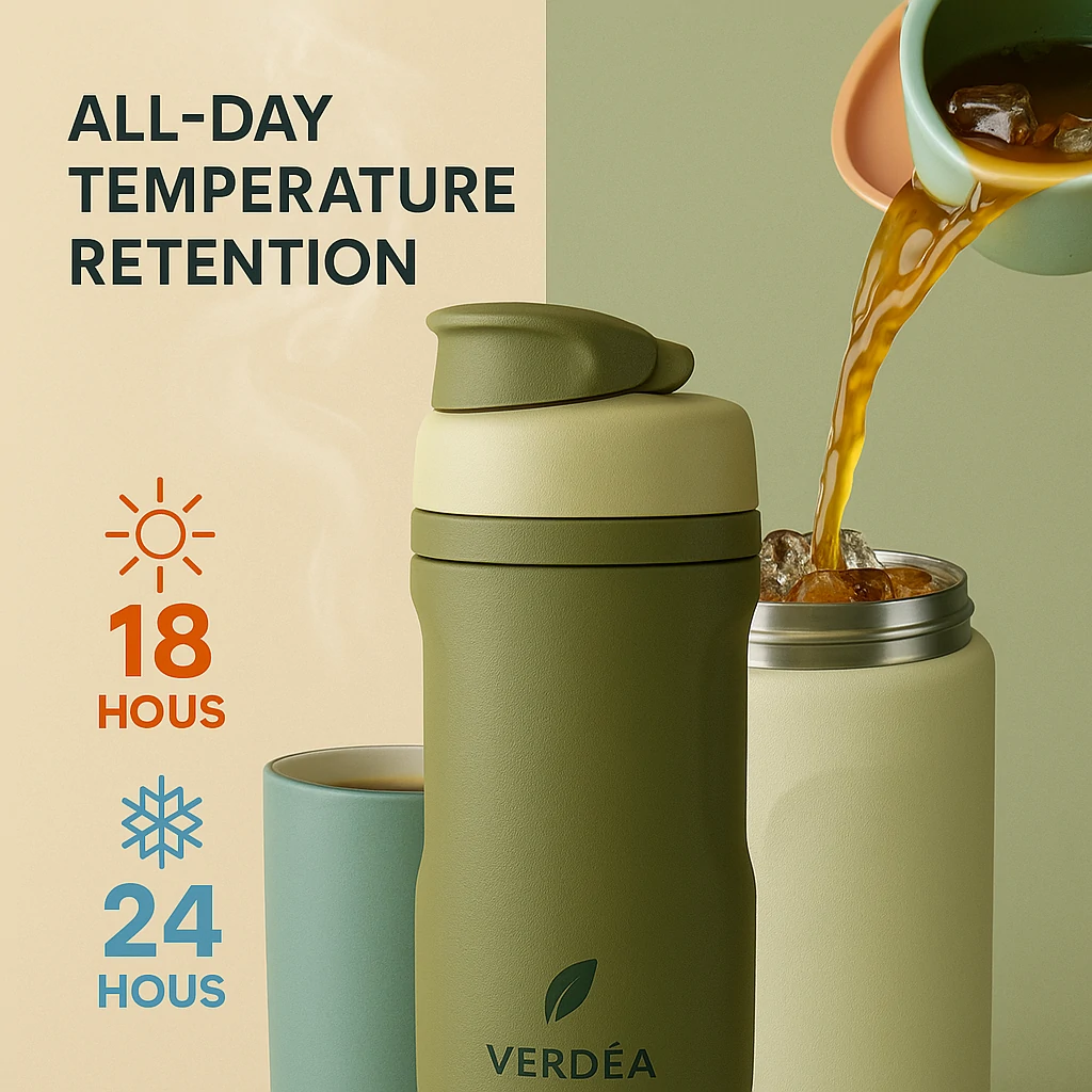 Durable SS304 stainless steel body, powder‑coated exterior, carry‑friendly design, and interchangeable Verdea lids across the series (where applicable).