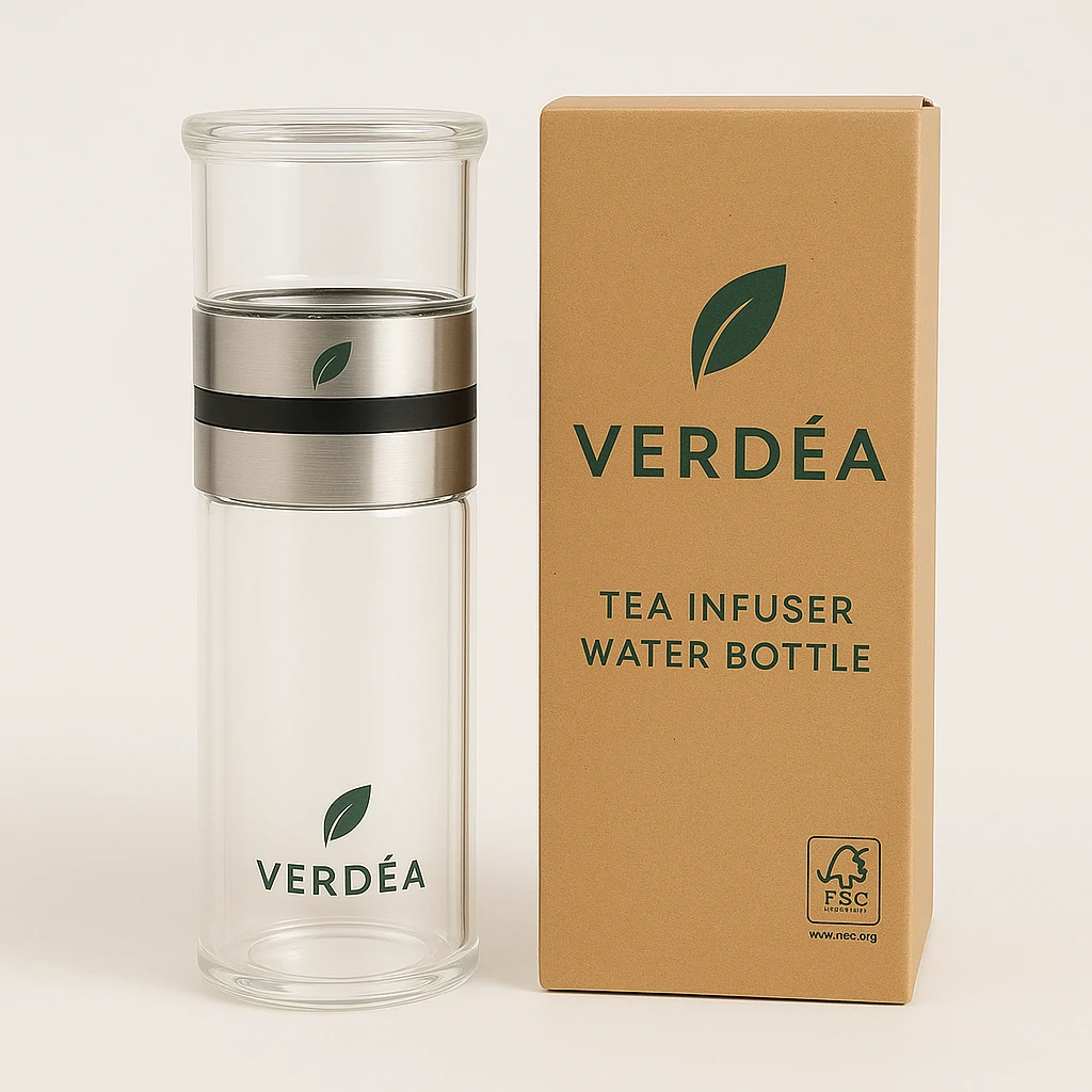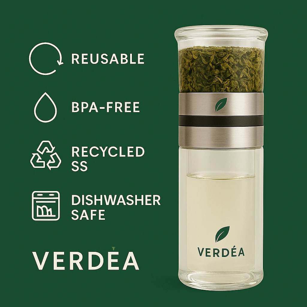 Why it matters: Reusable glass cup reduces single-use cups and enhances tea experience.